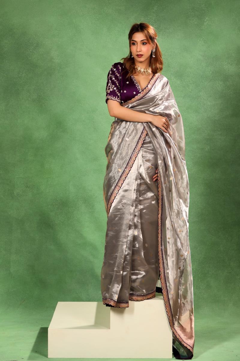 This Grey Tissue Silk saree features a metallic sheen characteristic of tissue weaves. The body is woven with Roopa Sona (Gold and Silver) zari buti. The pallu provides a distinct contrast with a gold zari woven ethnic brocade pattern set against a Rust base color. The saree borders are finished with handcrafted scalloped lace work. It is accompanied by an unstitched resham woven Chiniya Silk blouse piece, which features handcrafted lace detailing on the neckline and sleeves.