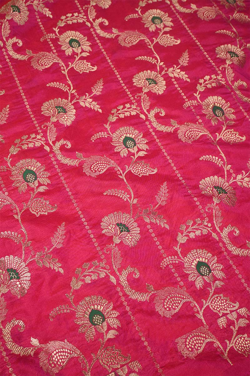 This hot pink dual-tone Banarasi silk fabric is detailed with golden zari floral motifs arranged in a vine-inspired leheriya jaal pattern. The design is further enhanced with red meenakari work, adding depth and contrast to the overall look of the fabric.