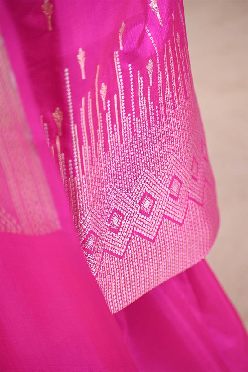 This Hot Pink Unstitched Suit Set is made from Pure Katan Silk. The kurta is purely featured by it's neckline, where precision-woven gold zari floral jaal design is crafted. Created using traditional supplementary weft techniques. The set includes a running bottom fabric in a matching purple shade. The Kurta is complemented by a shaded organza silk dupatta, which incorporates manual needlework (hand embroidery) on the borders and is finished with machine-stitched lace detailing along the edges.