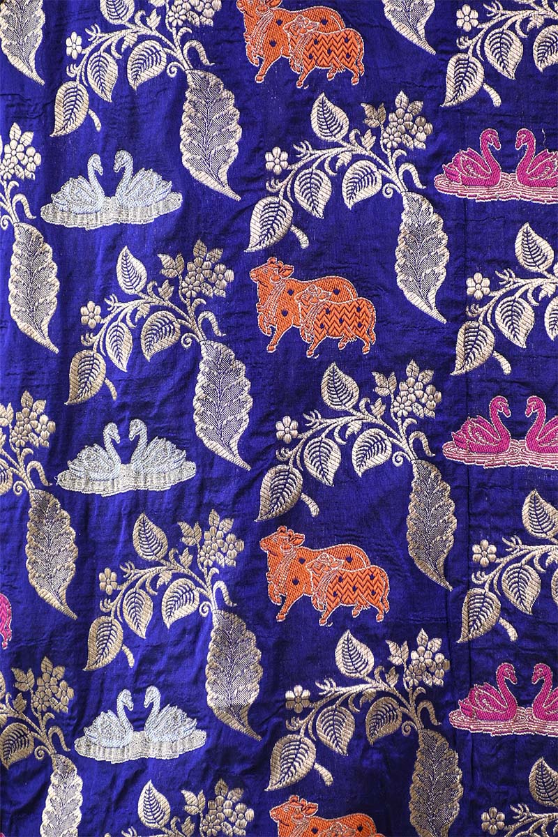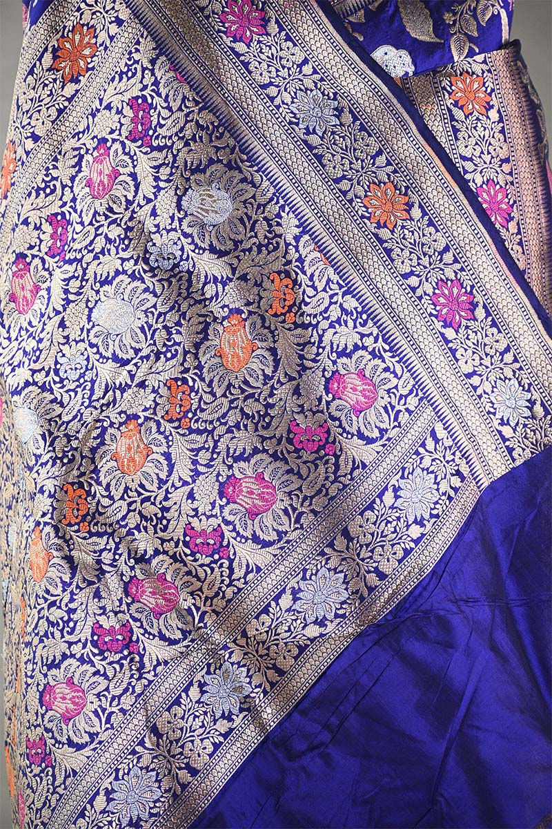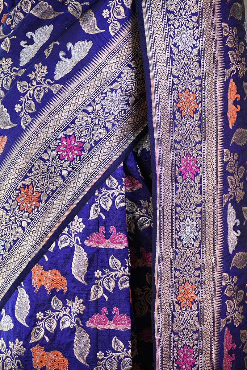 This ink blue pure Banarasi katan silk saree is woven with a gold zari floral jaal across the body, highlighted with resham meenakari cow and swan motifs. The border and pallu are intricately decorated with gold zari floral patterns, further enhanced with meenakari detailing. It is paired with a matching purple unstitched blouse piece finished with a zari woven border.