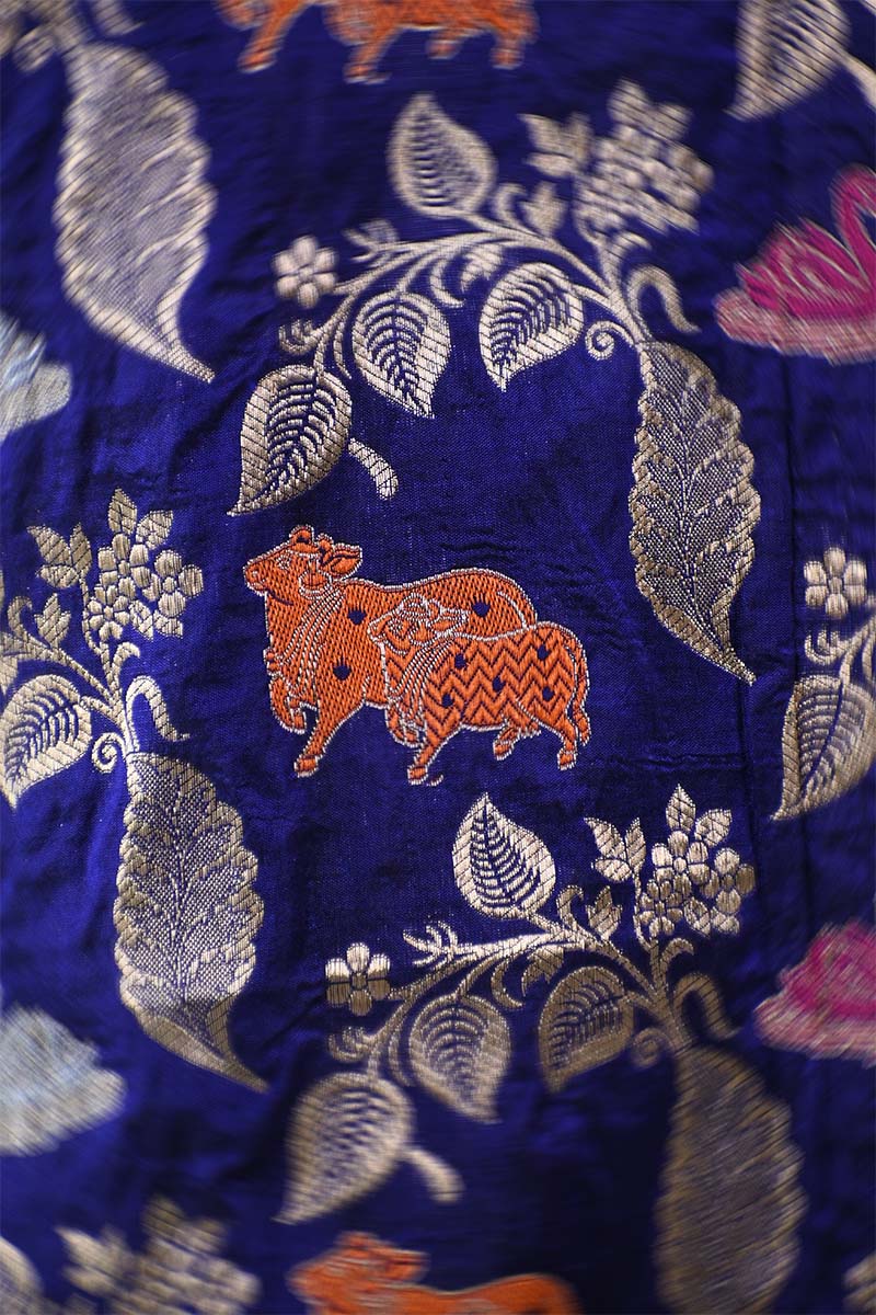 • Motifs/Designs: Gold zari floral jaal with resham meenakari cow and swan motifs