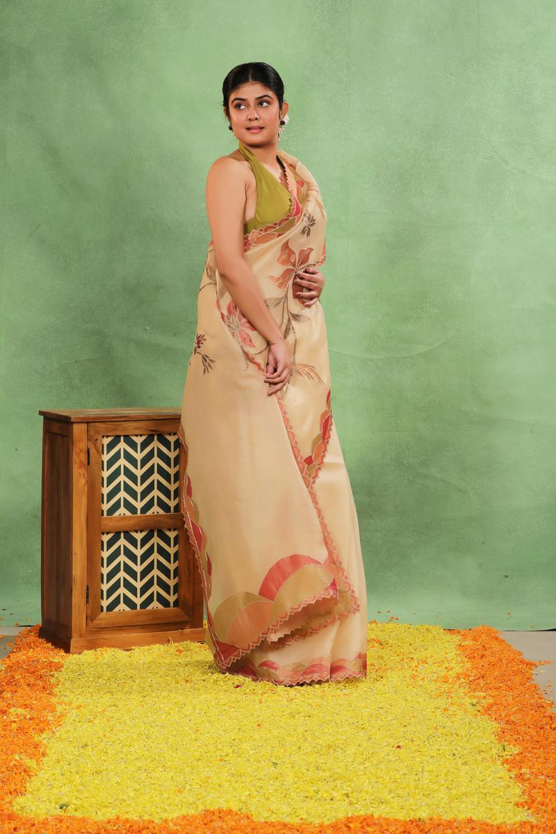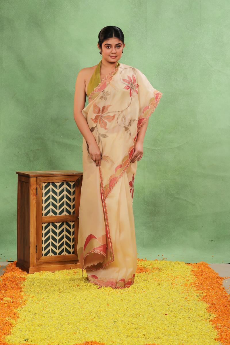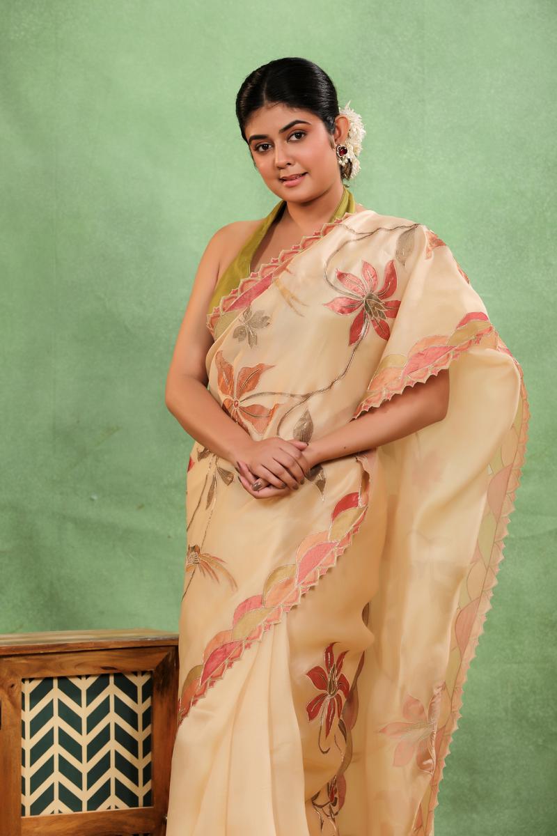 This Ivory Applique Organza Silk saree features a sheer texture with a metallic sheen. The design is characterized by a multicolor Applique floral vine pattern that flows diagonally across the pallu area. Large, blooming floral and bird motifs are executed in muted red and peach tones. The edges are defined by a scalloped pattern filled with alternating shades of red, peach, and olive-gold. The saree is accompanied by a matching unstitched Chiniya silk blouse piece featuring Sona Rupa (Gold and Silver) buti.