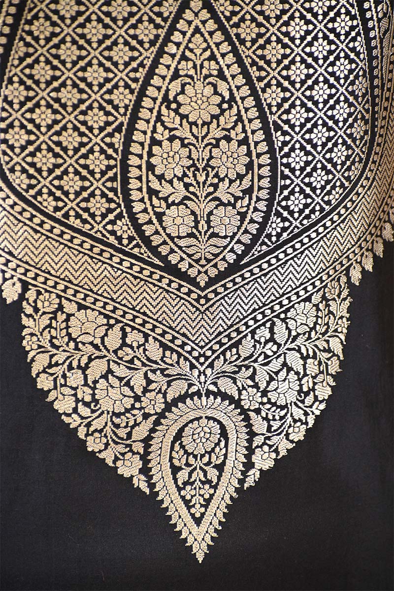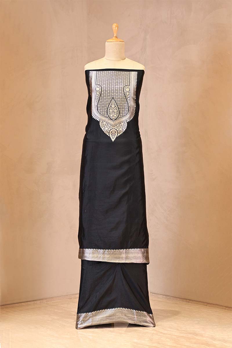 This Karishma Kapoor inspired black Banarasi Puna silk suit set is designed for those who love timeless elegance. The neckline and hemline are beautifully framed with silver zari floral detailing set within subtle checks, giving it a rich and graceful look. It comes with a coordinated bottom featuring a similar silver zari woven classic border at the ankle, completing the ensemble perfectly.