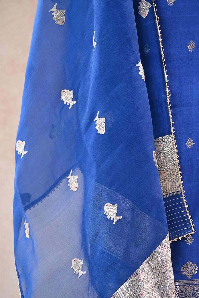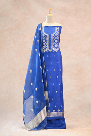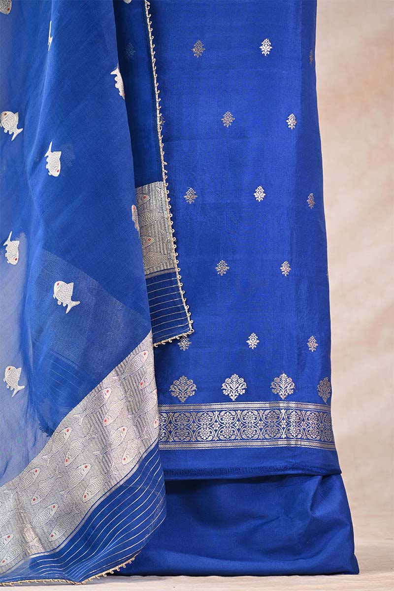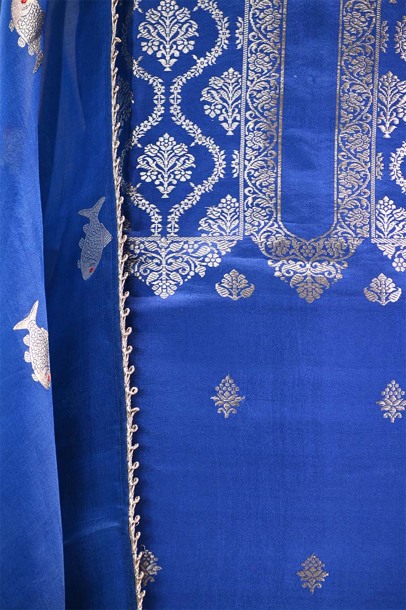 This Royal Blue Katan Silk Unstitched Suit Set is crafted from rich Katan silk and showcases silver zari detailing. The kurta features intricate silver zari woven floral work on the yoke, while the body is adorned with delicate silver zari floral buti, adding a graceful and elegant charm. The look is further enhanced with a finely woven silver zari hemline that gives the outfit a polished finish. The set is paired with a lightweight organza silk dupatta, beautifully highlighted with silver zari woven Matsya motifs, adding a subtle traditional touch. A matching bottom pant fabric completes the ensemble, making it ideal for your style and fit.