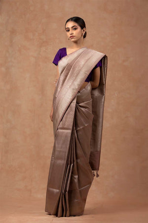 • The Saree is Crafted with watergold zari woven ethnic motifs all over saree border pallu.