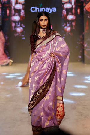 Indulge in the divine allure of our Lavender Handloom Organza Silk Saree, a symphony of sophistication and opulence. Luxuriously handwoven with gold and silver zari leheriya stripes, it captivates with a lavish contrast meenakari handwoven border and pallu, adorned with intricate ethnic handweaving. The richness of this ensemble is further accentuated by the accompanying contrast unstitched blouse piece, ensuring you radiate regal splendor at every event. Elevate your style with this embodiment of luxury and tradition.