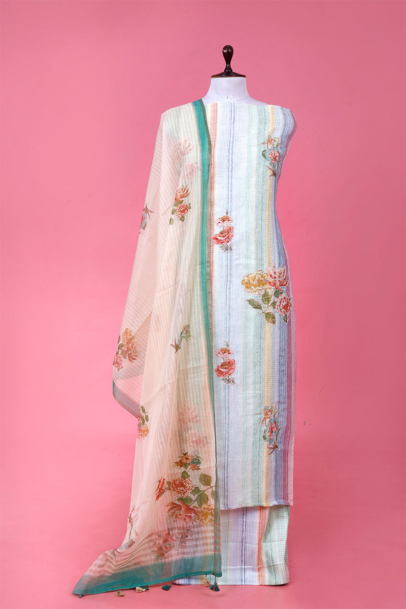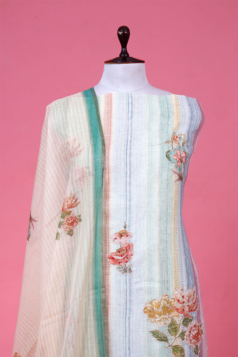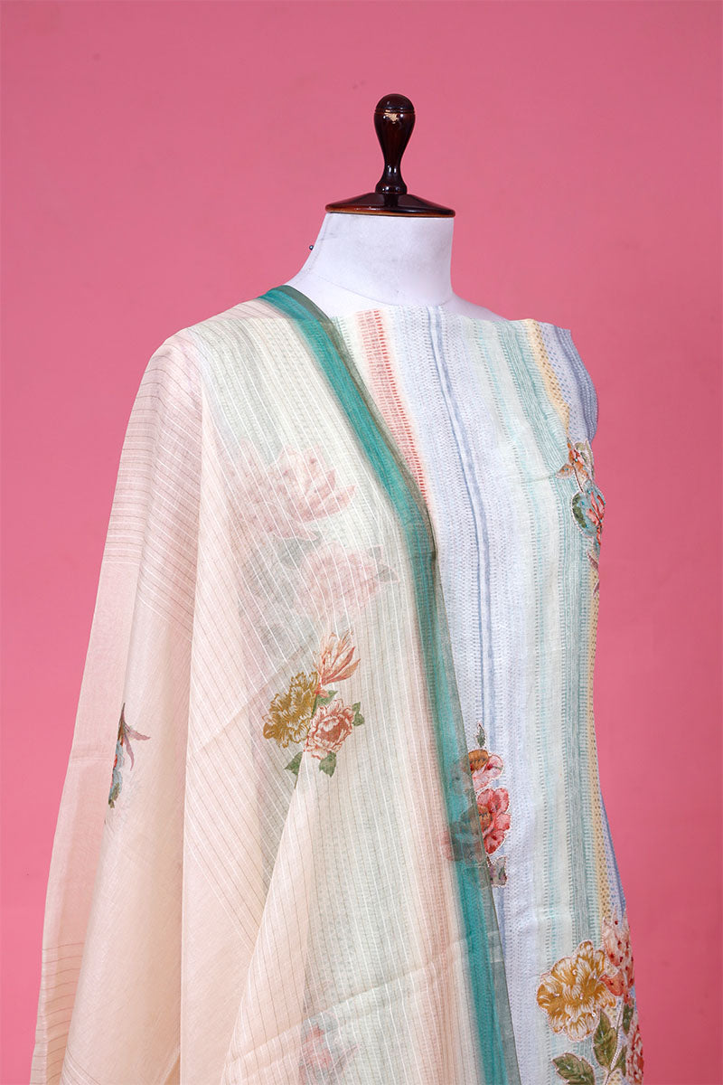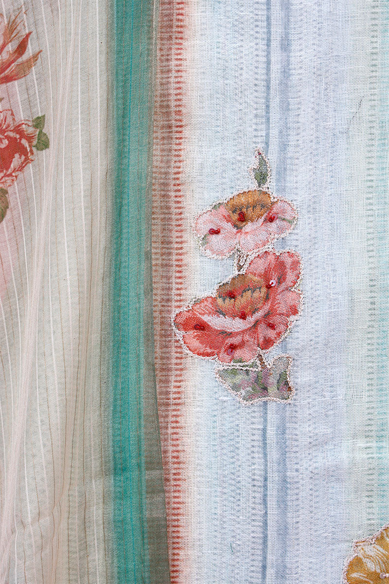 • Uplifts with gold zari stripes woven & floral printed mulmul cotton dupatta