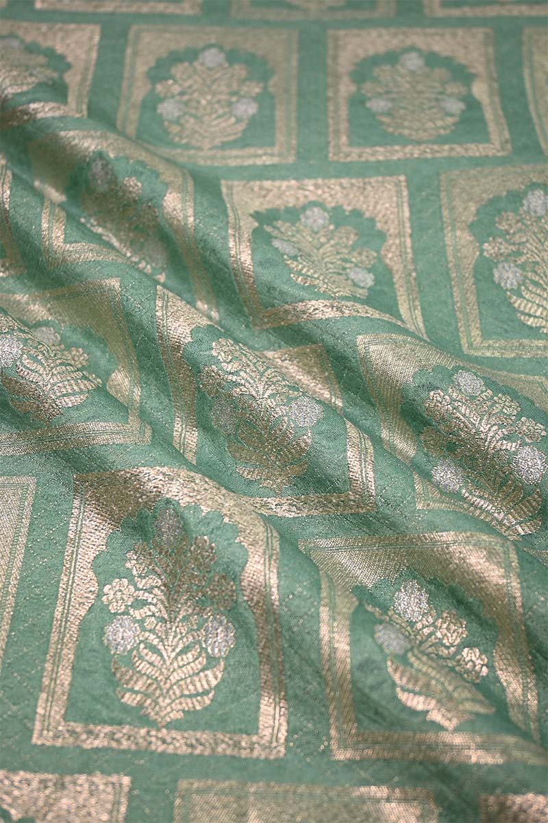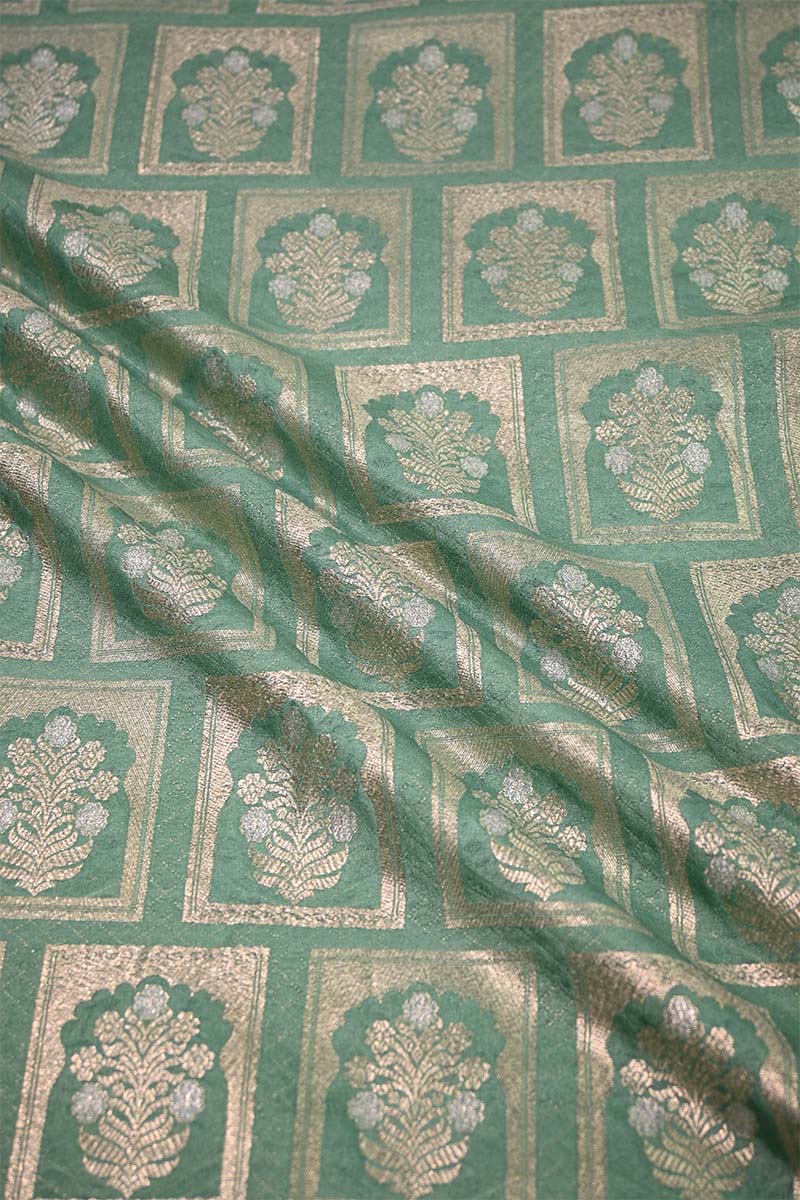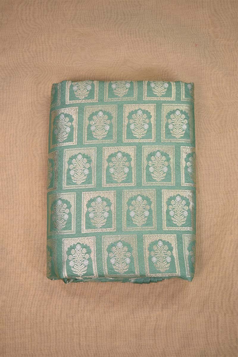 This Mint Green Banarasi silk fabric features an intricate pattern inspired by Rajwada floral ornament architecture, woven with gold and silver zari throughout the fabric. The combination of delicate motifs and dual-tone zari makes it an excellent choice for stunning blouses or dresses.