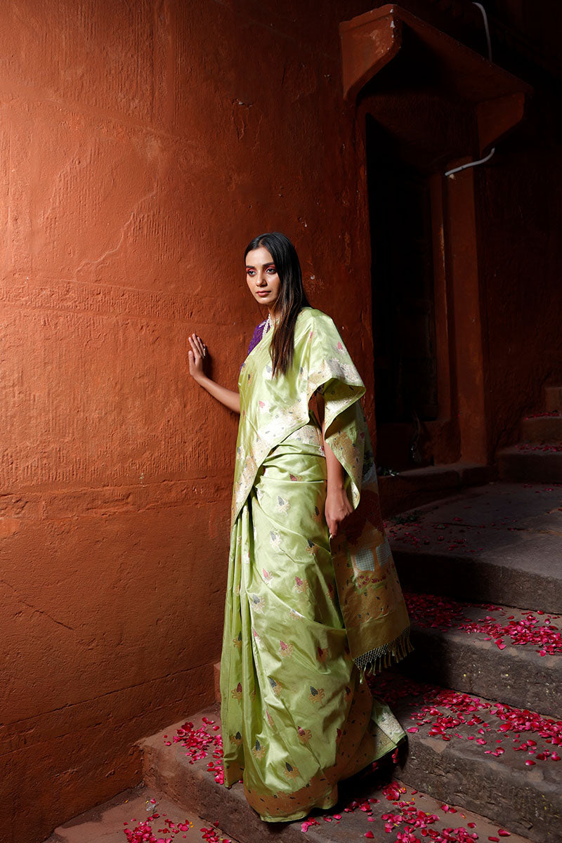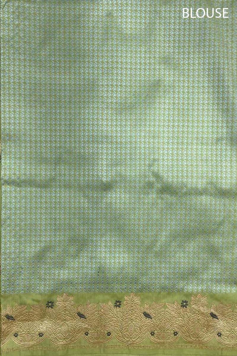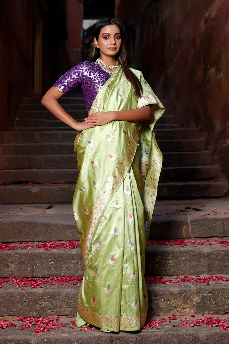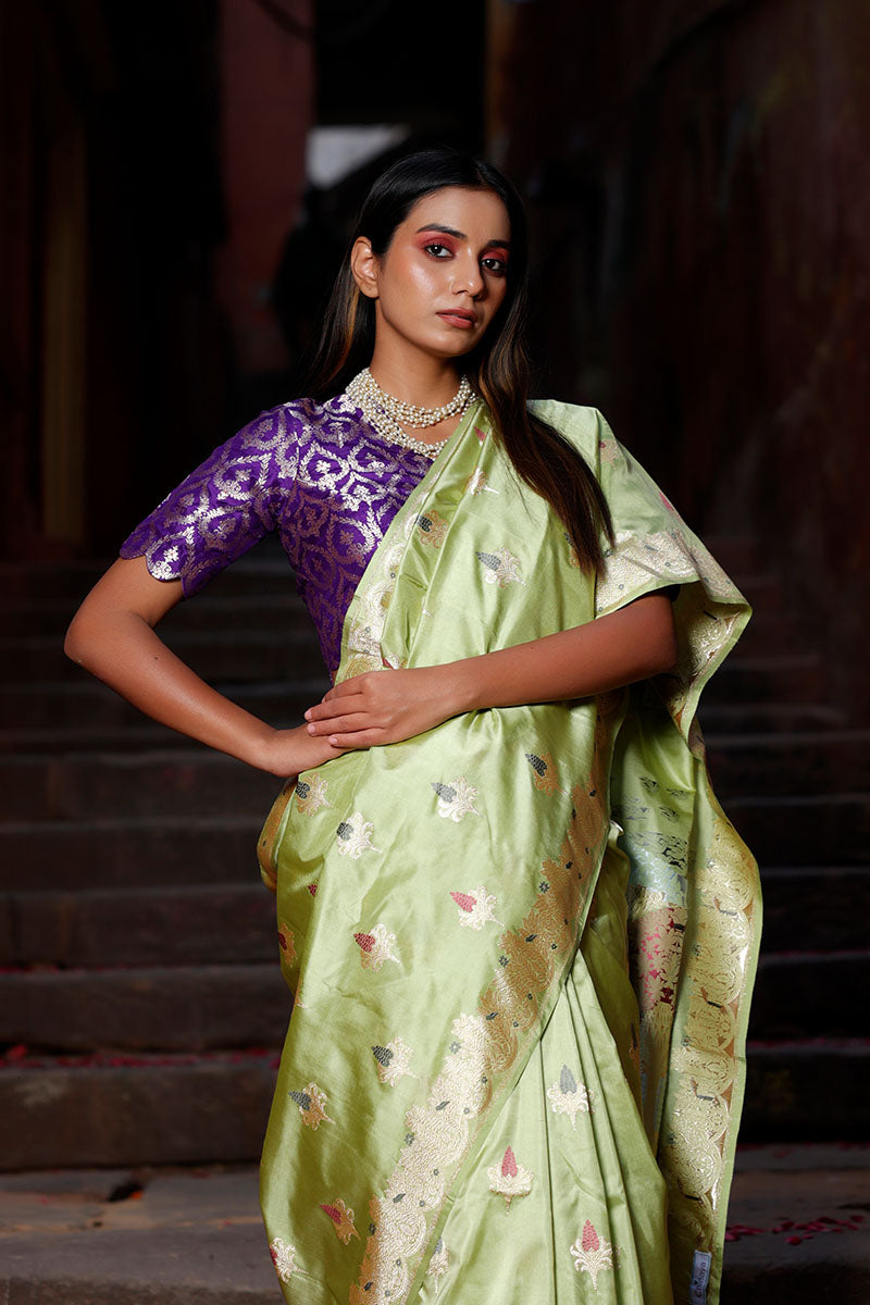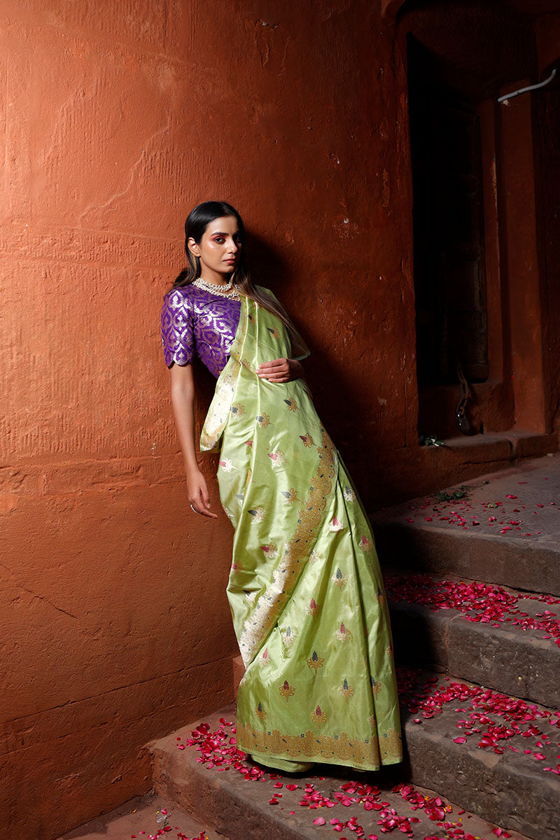 Look your best each time when you wear this Banarasi katan silk saree, featuring real gold-coated zari kadhwa woven floral meenakari buta. The saree is adorned with a gold zari ethnic handwoven border and a Tanchoi handwoven meenakari pallu, adding exquisite details. Crafted from luxurious katan silk, the saree is light in weight and comfortable to wear. Furthermore, it comes with a matching unstitched blouse piece.