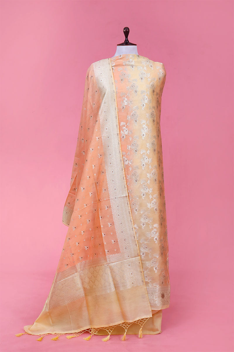 • Features with watergold zari & Meenakari woven floral jaal throughout the kurta, Subtle shaded texture add a touch of Sumtuousness & accompanied with running bottom.