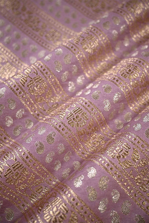This lilac Banarasi silk fabric features gold zari woven floral slanting stripes alternated with silver zari paisley motif butis. The dual-tone zari work and soft color tone make it a graceful choice for blouses, sarees, or ethnic outfits.