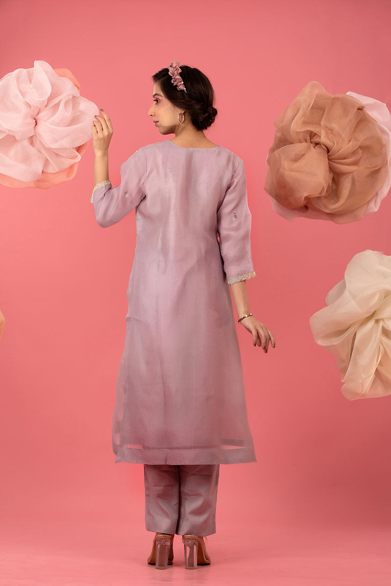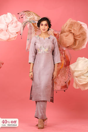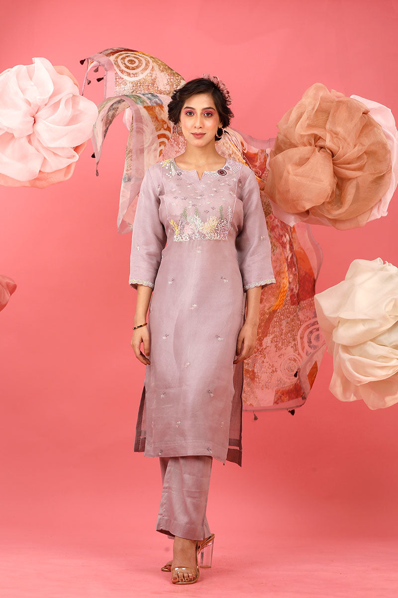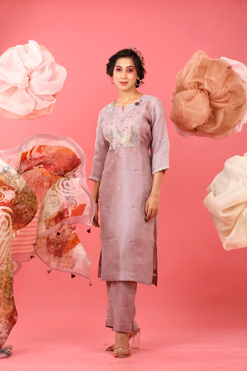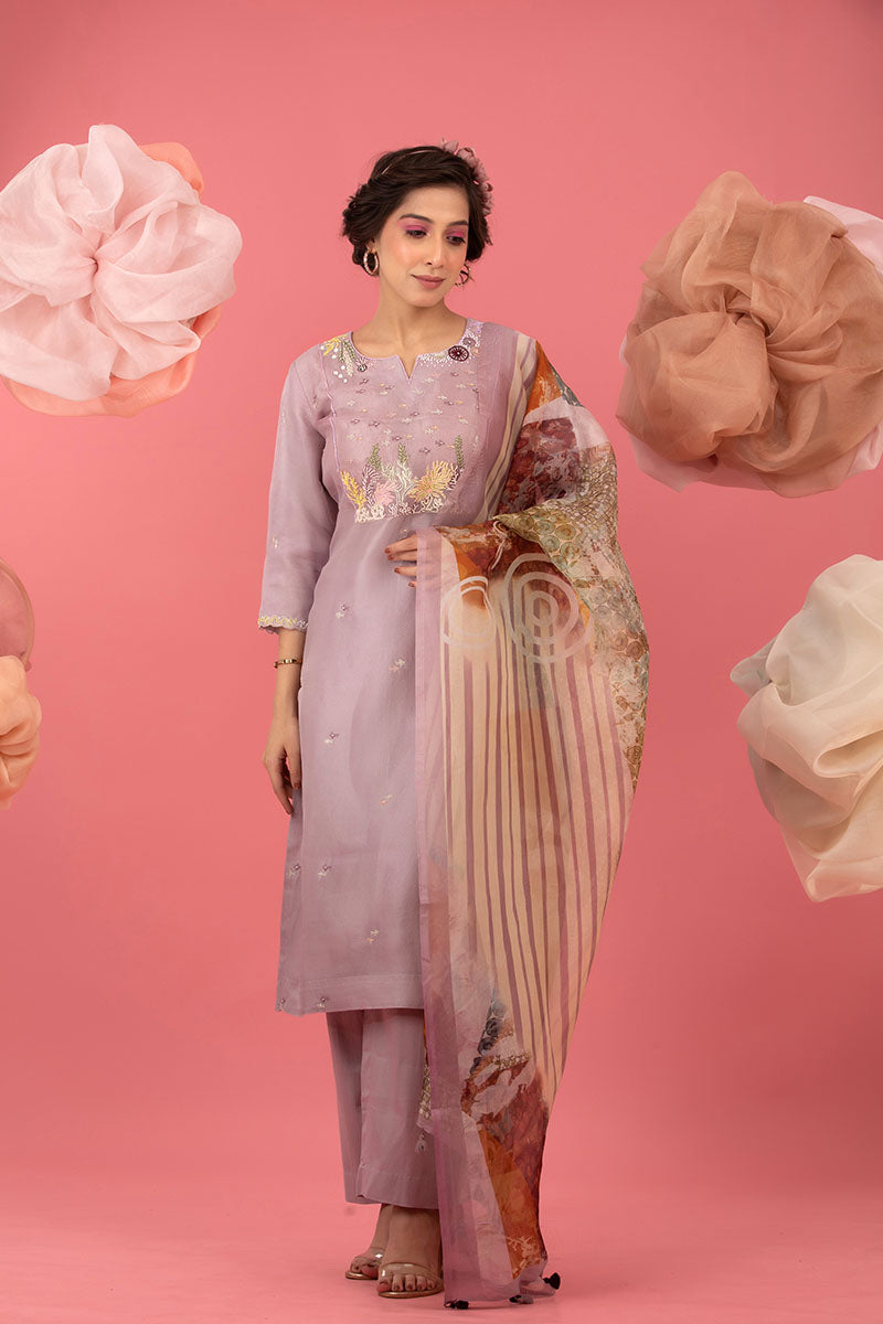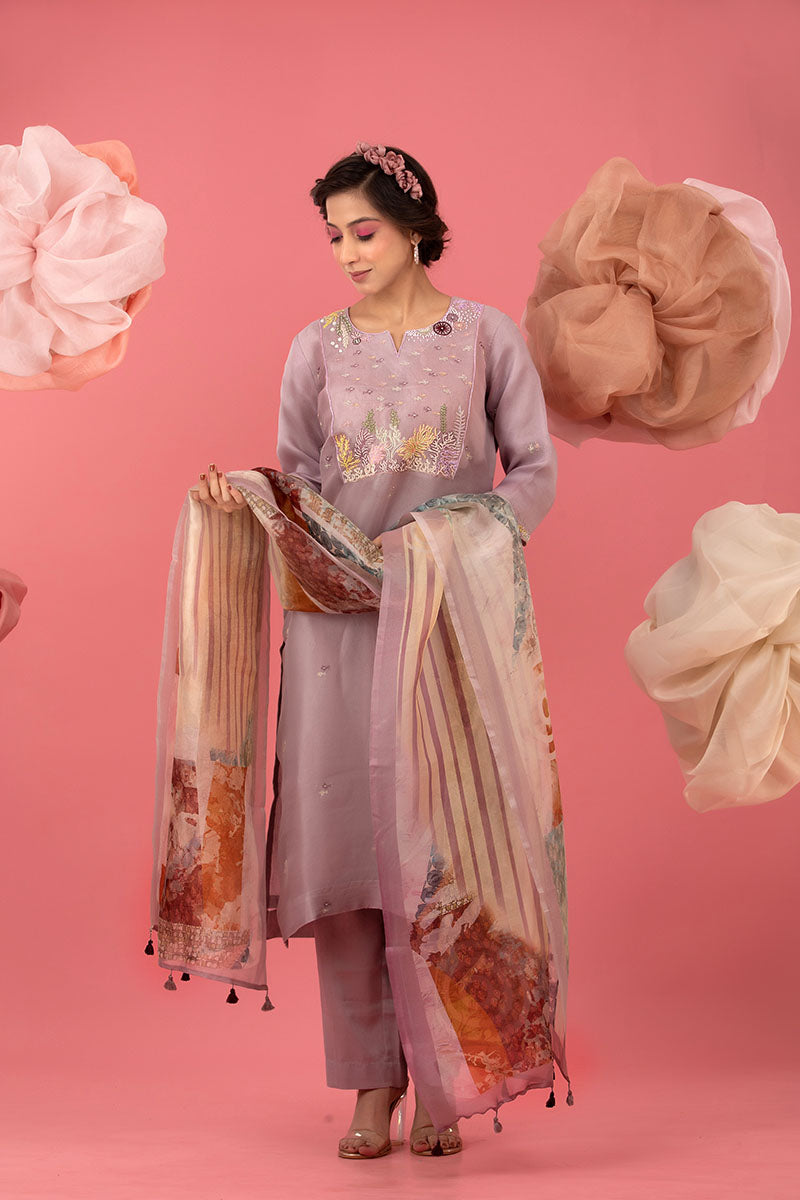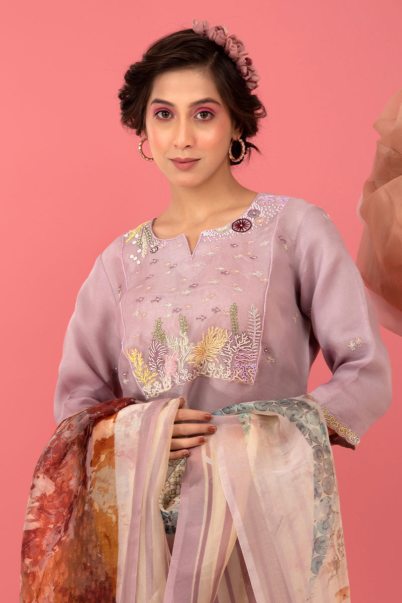 Unveil sheer elegance from the enchanting Coral Dreams Collection by Chinaya Banaras with our mesmerizing Lilac Organza Silk Suit Set. Imagine a canvas of intricate Hand Embroidery and embellished marine motifs adorning the Organza Silk Kurta, creating an ethereal neckline that captivates the eye. With graceful 3/4th sleeves, this ensemble emanates an aura of refined grace. Paired with a Digital Printed Organza Silk Dupatta and matching bottom, it's not just attire—it's a harmonious symphony of sophistication, promising a refined and alluring look that enchants at every turn.