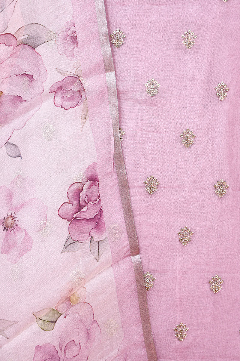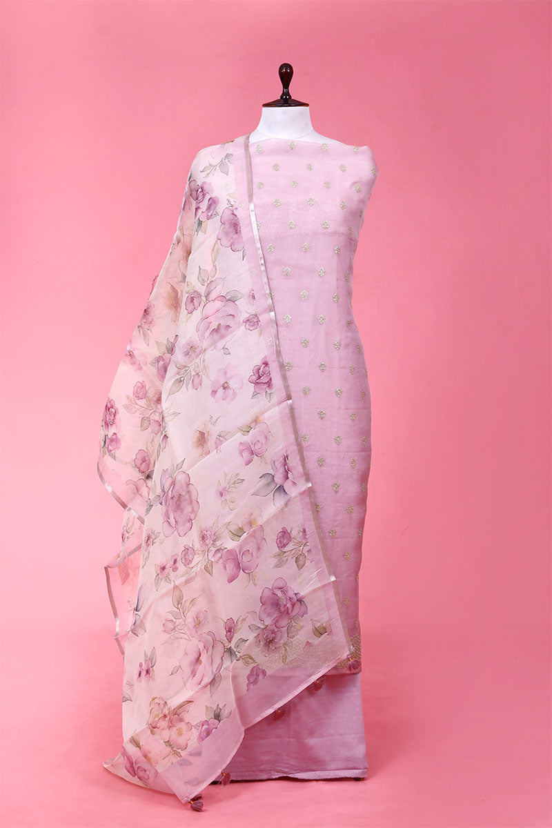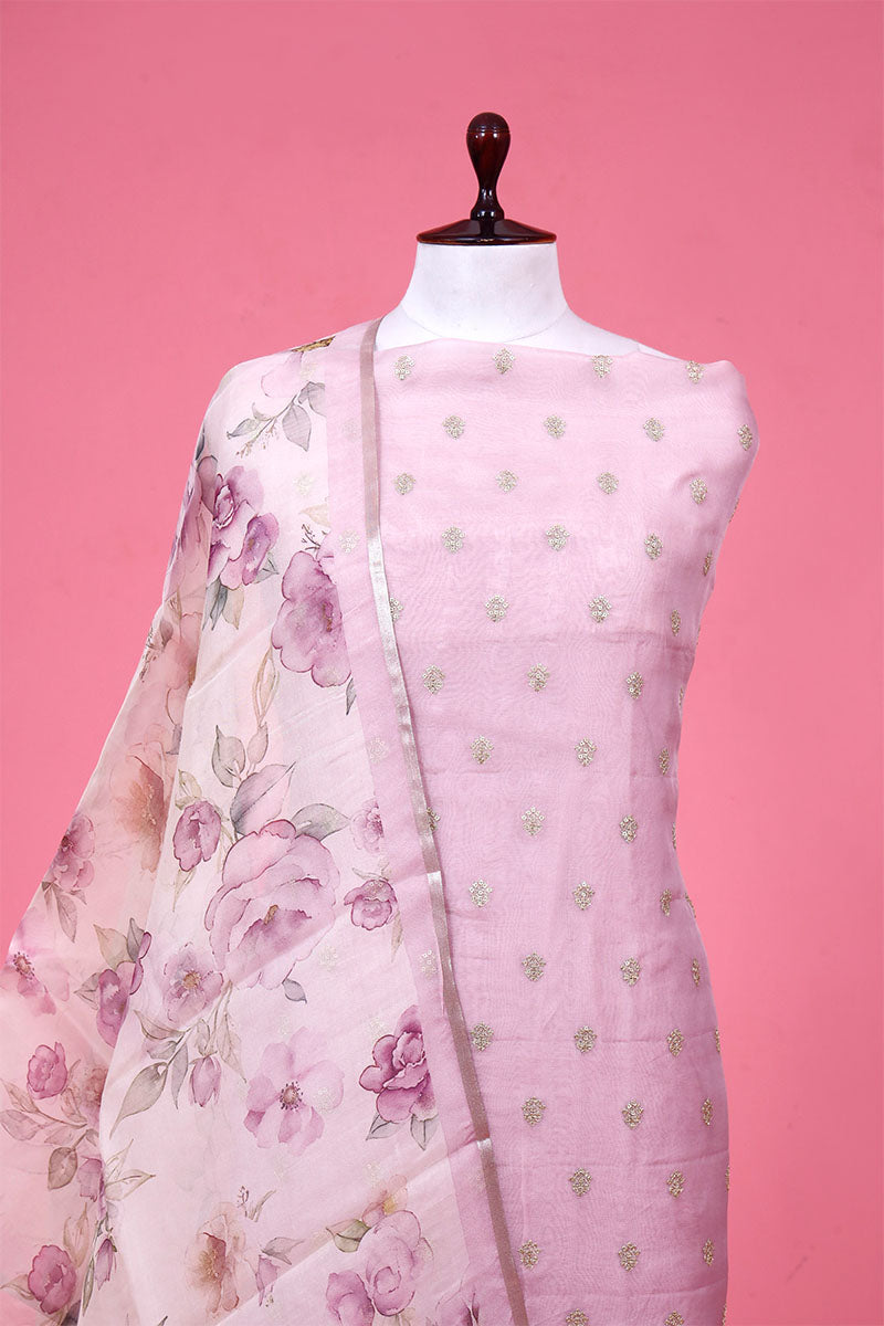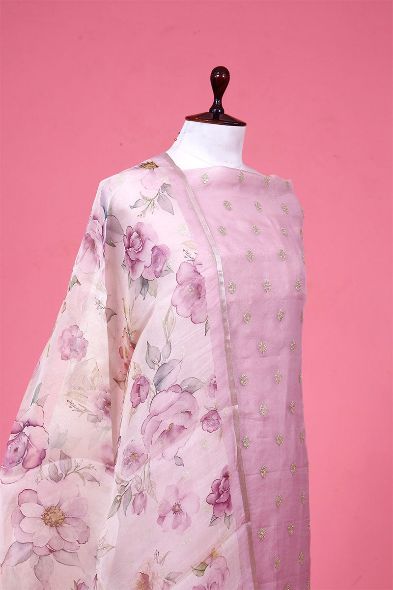 - This Lilac unstitched Suit Set In organza silk fabric.