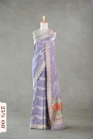 This lilac Katan silk Banarasi saree is handwoven in the Kadhwa style with gold and silver zari bird motifs arranged in a leheriya pattern. The saree is complemented with a gold and silver zari handwoven meenakari border and a tanchoi handwoven pallu. It comes with a matching unstitched blouse piece for custom stitching.