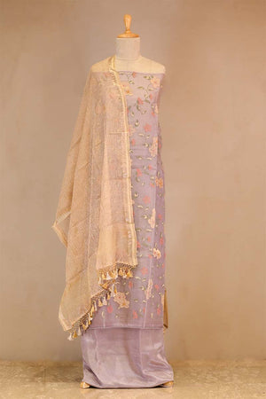 This Banarasi organza silk suit set is designed with resham floral jaal embroidery all over the kurta. The hemline is finished with delicate lace, giving it fine detailing. It is paired with a cotton silk bottom pant and completed with a golden crushed tissue silk dupatta, highlighted with a zari woven border. A versatile suit piece that blends embroidery with subtle textures, perfect for traditional occasions.