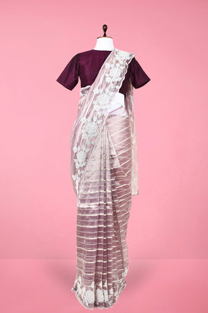 Features: It has woven silver zari stripes all over the saree and it has a katdana & moti embellished scalloped border comes with matching Unstitched blouse piece.
