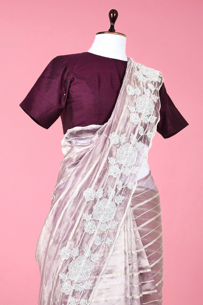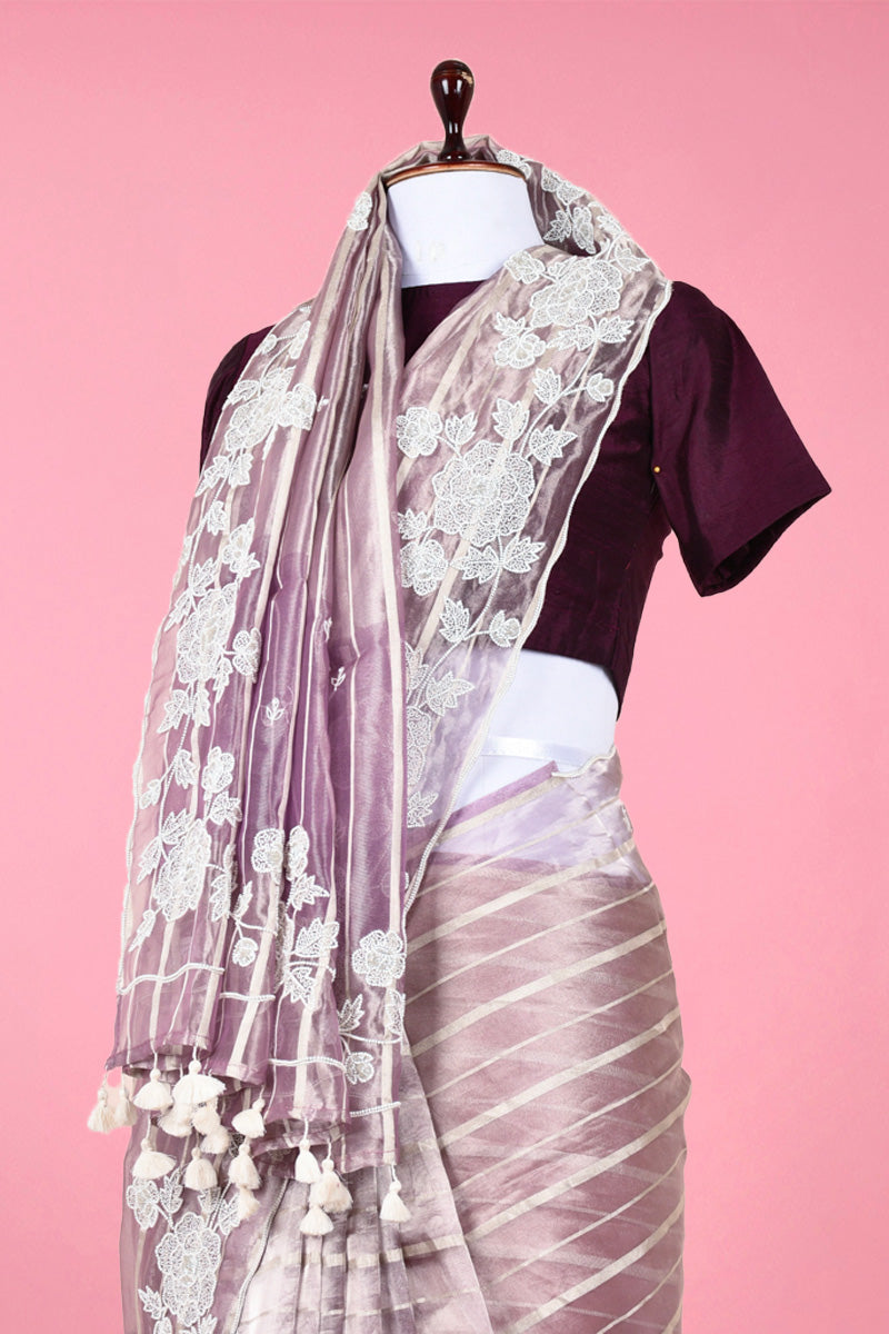 It is impossible to go unnoticed at the next event when you wear this stunning purple-colored silk saree. Boasting woven silver zari stripes all over along with katdana and moti embellished scalloped border, this saree is truly one of its kind. Made of quality tissue silk, this saree is high in comfort and light in weight. It is accompanied by a matching blouse that adds to its appeal.