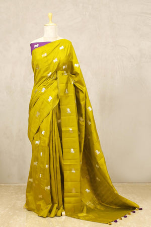 This Lime Green Banarasi Chiniya silk saree is handloom woven with intricately gold zari Aghanya (cow) motifs across the entire body, symbolizing cultural heritage and grace. The saree is paired with a green contrast unstitched blouse piece, also featuring gold zari woven Aghanya motifs, allowing for a coordinated and personalized look.
