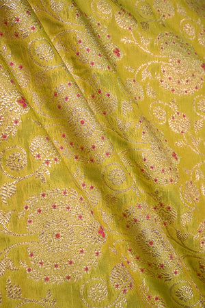 This lime green Banarasi silk fabric features a dual-shade base of yellow and green, creating a subtle blended effect. It is adorned with intricately woven gold zari floral jaal and ethnic buta motifs, further enhanced with pink meenakari accents that add a soft contrasting touch to the fabric.