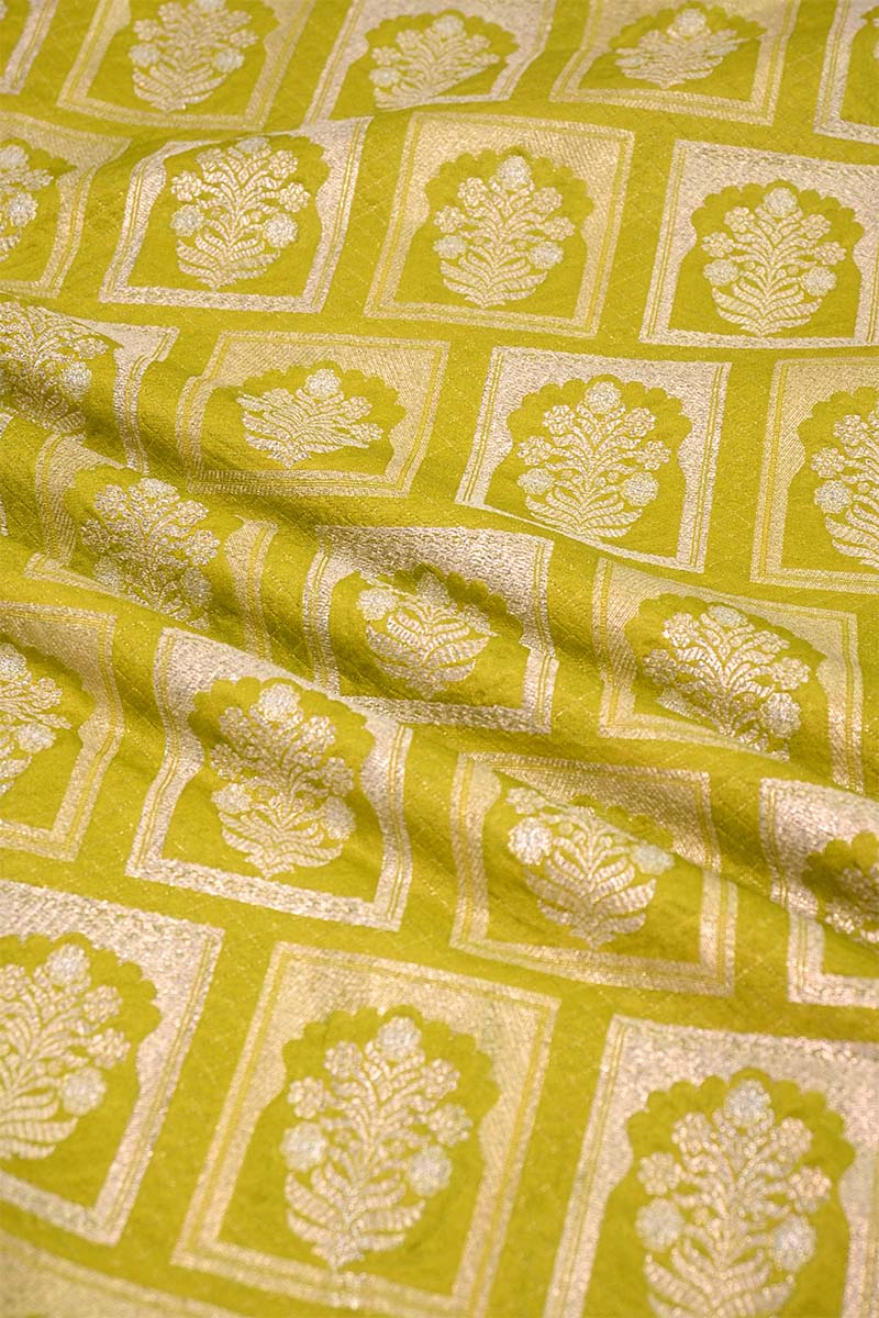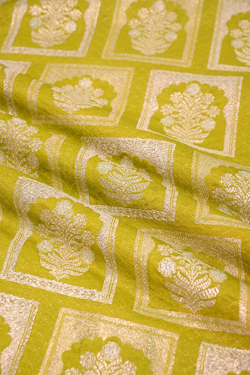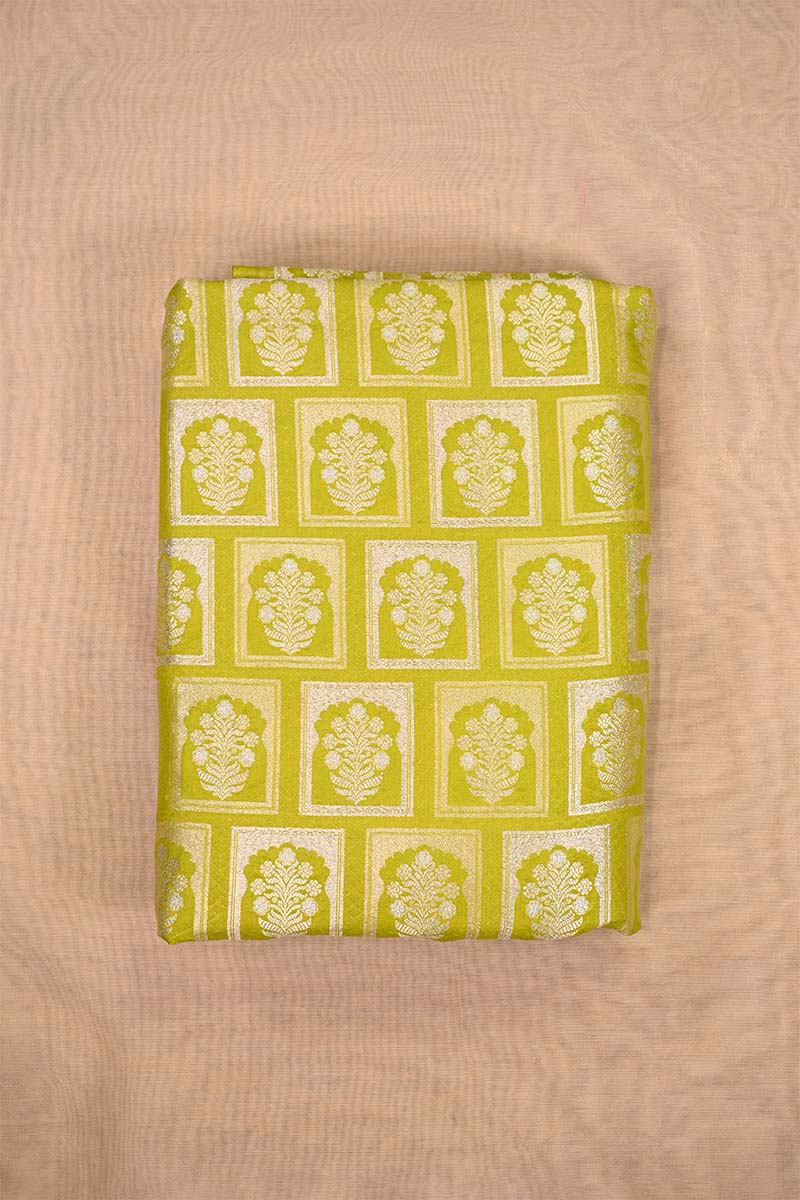 This Lime Green Banarasi silk fabric features an intricate pattern inspired by Rajwada floral ornament architecture, woven with gold and silver zari throughout the fabric. The combination of delicate motifs and dual-tone zari makes it an excellent choice for stunning blouses or dresses.