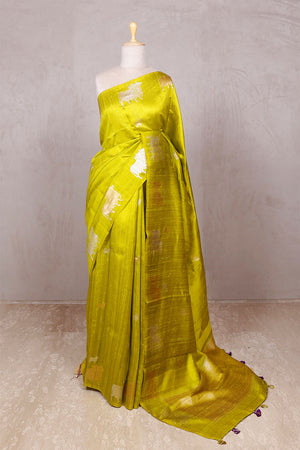 This Lime Yellow raw silk Banarasi saree is woven with alternating gold and silver zari Pichwai motifs woven beautifully across the body and border. The pallu features intricate zig-zag gold zari woven geometrical brocade work. It comes with a contrast unstitched blouse piece, allowing for customized styling.