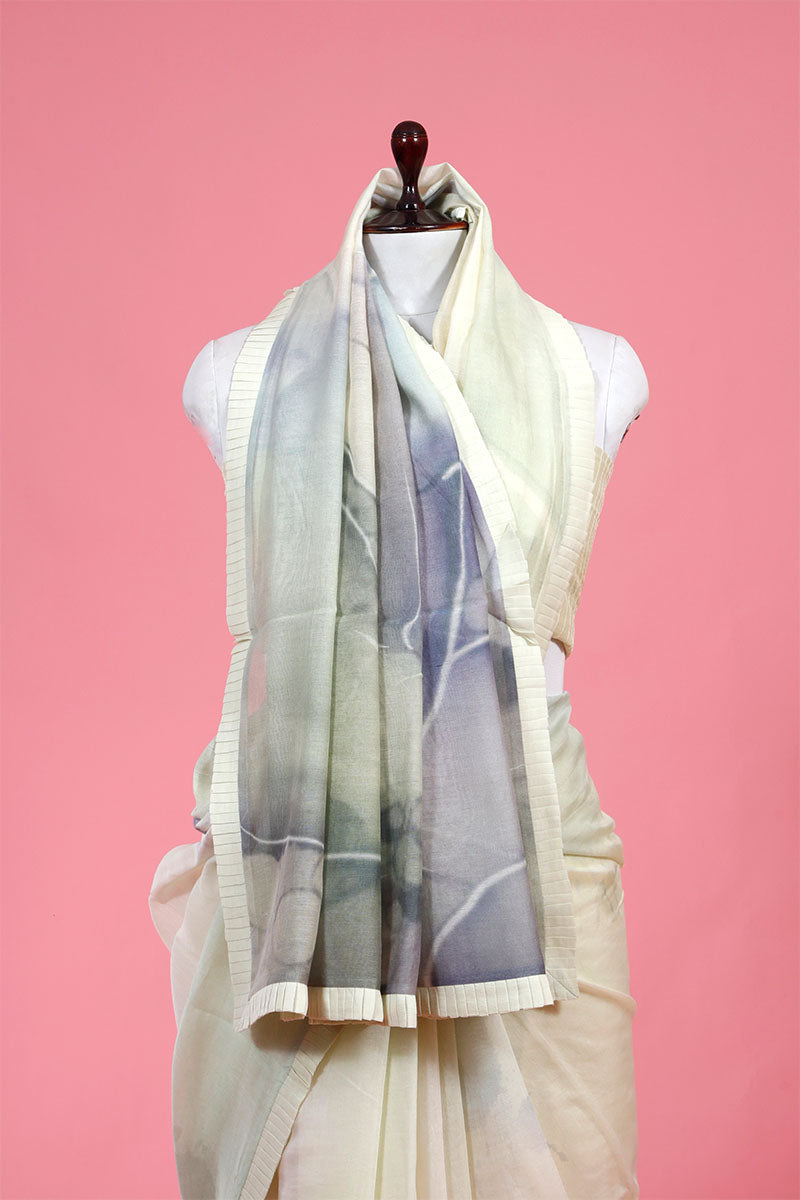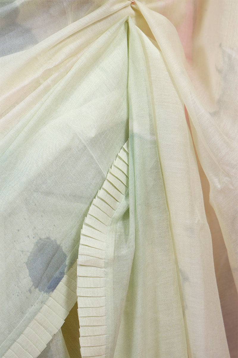 Level up your style game by adding this Liril green floral printed cotton saree to your closet. Adorned with floral printed motifs all over the saree, along with matching frills on the border and pallu to enhance it, this outfit is a must-have piece in your closet. Crafted from premium Mulmul cotton fabric, it offers lightweight and breathability throughout the day. Complete the look by adding a matching unstitched blouse, statement jewelry, and watch, and slay your look by wearing minimal makeup according to the event. This saree is ideal for any occasion