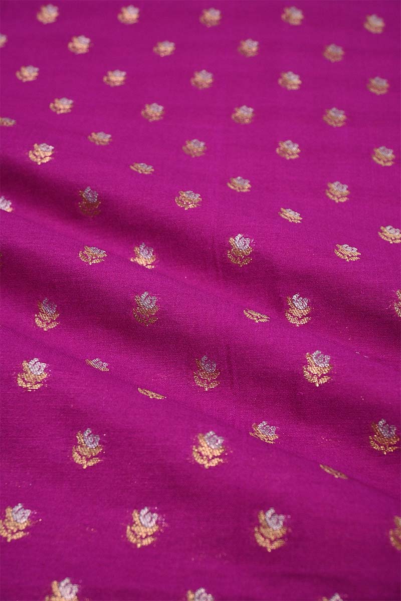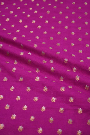 This Magenta Banarasi silk fabric features an intricate gold and silver zari floral buti woven all over, highlighted with gold zari. Made with a blend of 90% pure silk and 10% semi-silk, it offers both beauty and durability—perfect for designing standout blouses or dresses.