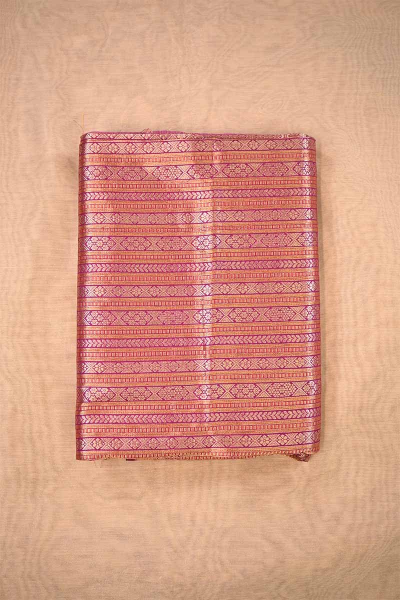 This Magenta Katan Banarasi silk fabric features geometrical floral gold zari woven stripes, beautifully adorned with yellow and orange detailing. The resham weaving between the stripes adds subtle contrast and texture, making it an excellent choice for traditional or festive outfits.