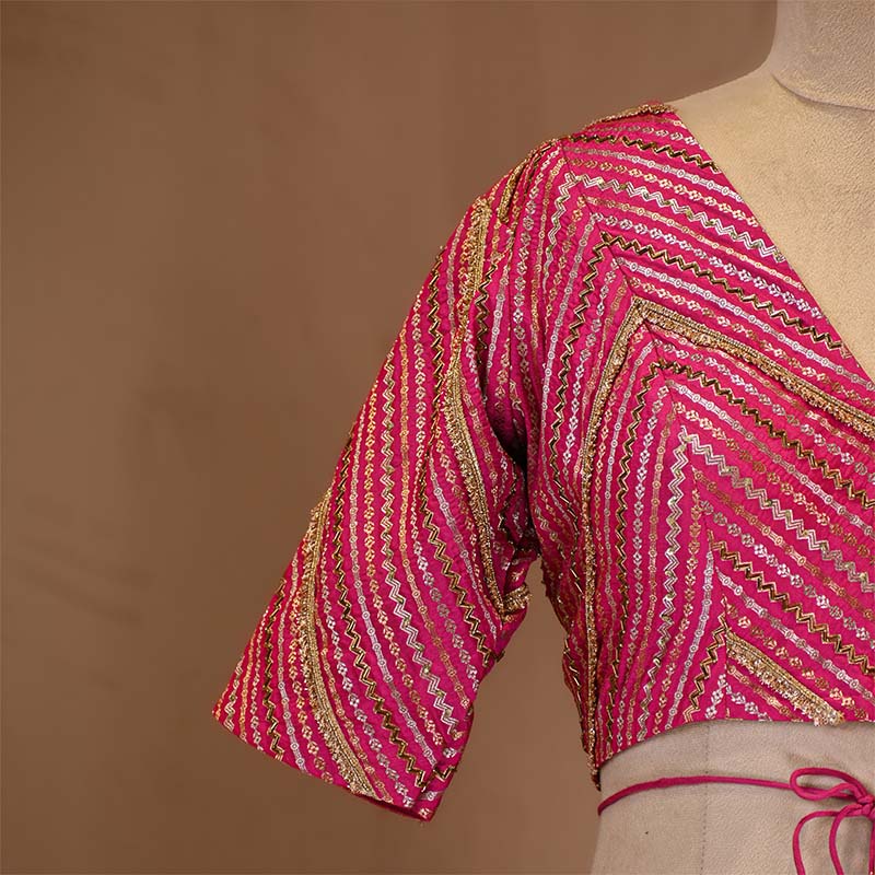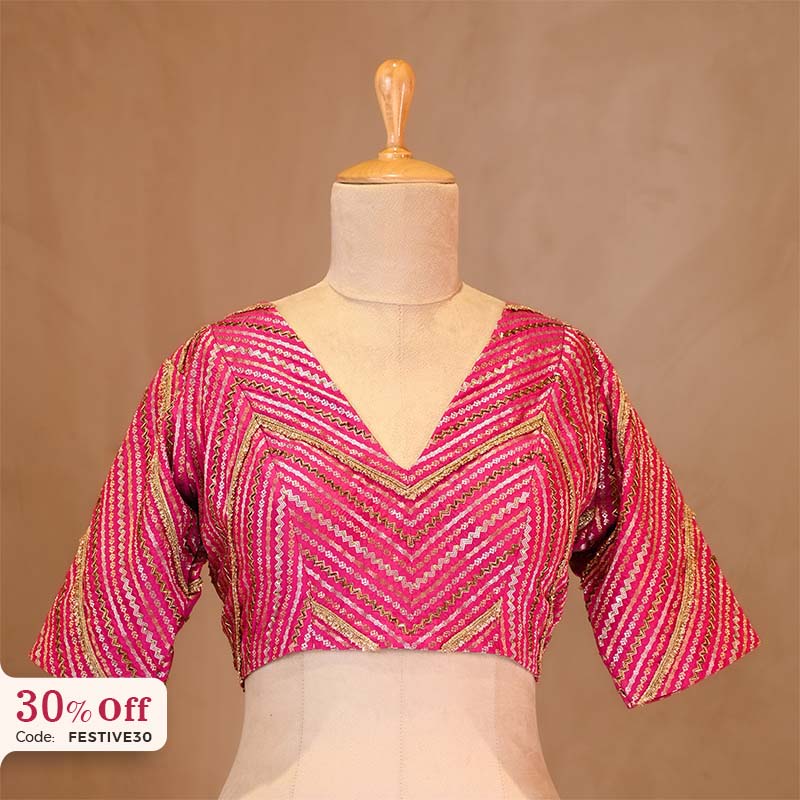 This magenta pink Banarasi blouse features silver and golden zari woven geometrical stripes, enhanced with delicate hand embellishments using beads and a lace border. Designed with a V-shaped neckline and half-sleeves, it also features a fancy tassel at the back for added detail. This blouse is ideal for festive and special occasions, offering a refined finish to your saree ensemble.