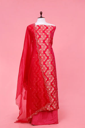 This magenta-pink Banarasi silk dress material is a striking choice for festive and special occasions. The kurta features an intricate gold zari woven jaal and rangkat pattern, enhancing its beauty. It comes with a running bottom and is elegantly complemented by a hand-embroidered dupatta adorned with Aari work and a scallop border, adding a touch of sophistication to the ensemble.