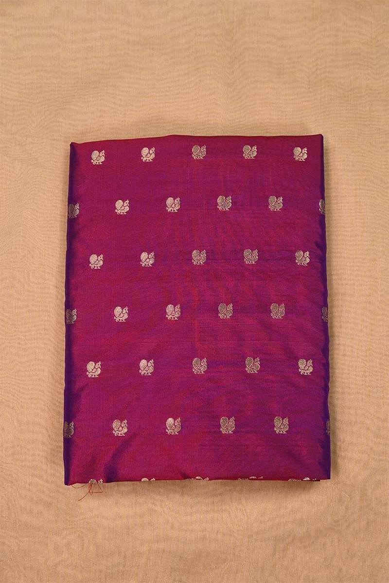 This magenta pink handloom pure Banarasi Katan silk fabric features delicately woven small mayur (peacock) motifs in gold zari across the fabric. Its vibrant base color and traditional motif design make it ideal for creating beautiful blouses or ethnic wear outfits.