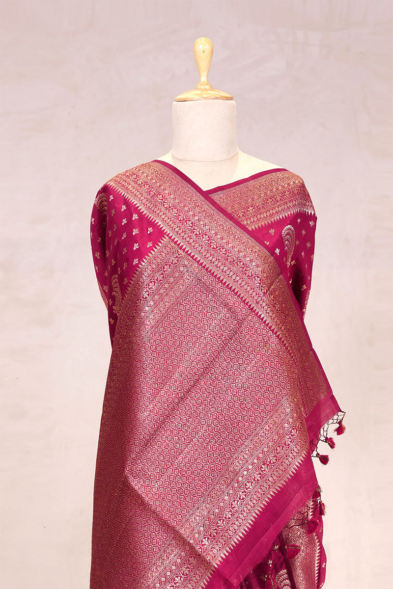 This rust red chiniya silk saree is woven with gold zari ethnic buta and small floral butis spread across the body, creating a balanced and intricate design. The saree is further accentuated with a floral antique zari woven border and pallu, adding depth to its traditional appeal. It comes with a matching unstitched blouse piece, allowing for custom tailoring.