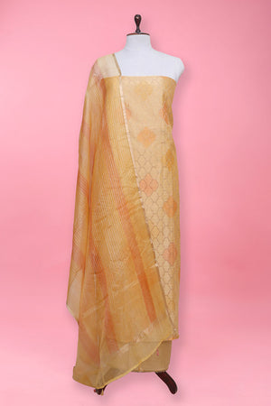 Experience the timeless allure of our Chanderi Silk Dress Material. The kurta is adorned with exquisite gold zari woven geometrical motifs, enhanced by delicate hand brushing for a captivating touch. Paired with an ethereal organza silk dupatta, featuring stunning gold zari woven stripes and rangkat stripes, this ensemble exudes elegance. Complete the look with the plain matching bottoms and embrace the grace and sophistication that Chanderi silk offers.