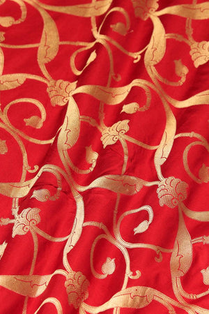 This pure maroon Banarasi Satin silk fabric showcases a gold zari ethnic floral jaal pattern woven throughout. The rich texture and intricate design make it an excellent choice for creating a graceful blouse or dress.