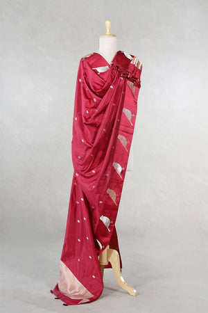 This Maroon Banarasi silk dupatta features 5 Kadhi satin silk border embellished with intricately woven gold zari bird motifs. The body of the dupatta is designed with 2 Kadhi adorned with exquisite gold zari woven flower buti, while the pallu showcases a stunning gold zari woven pattern.
