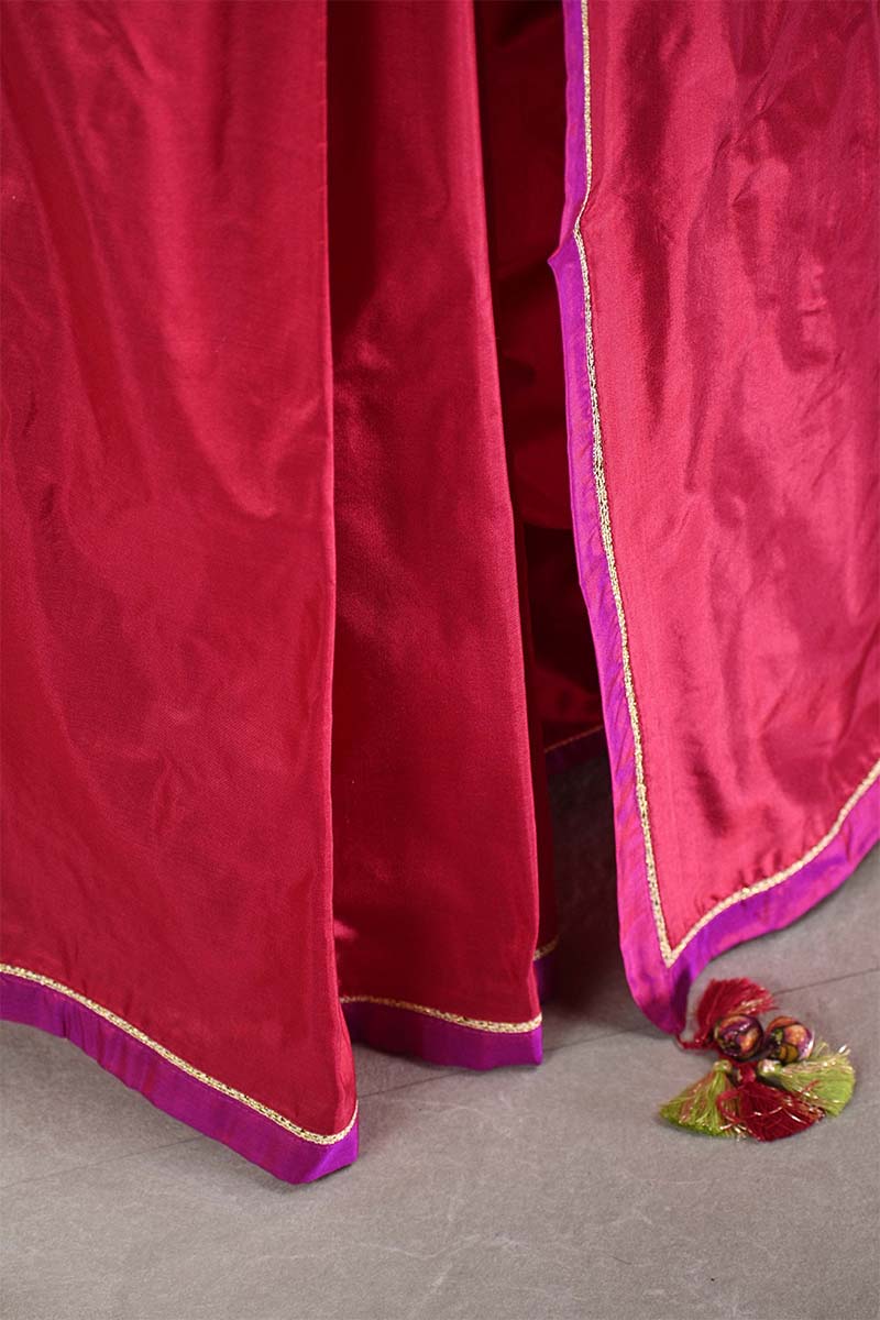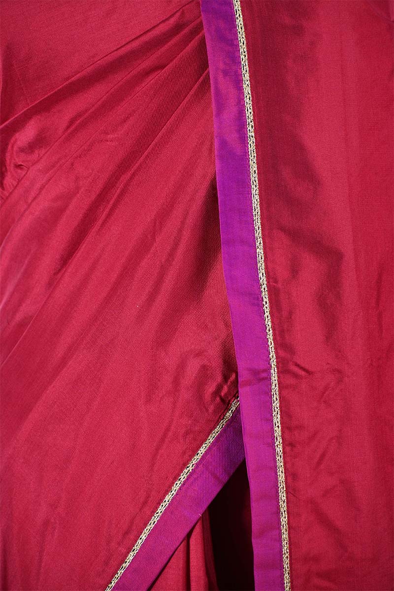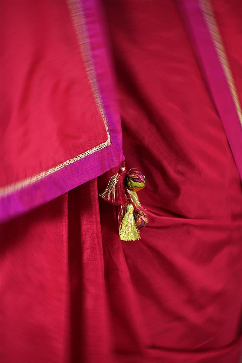 • Purple narrow border with golden zari piping; pallu corners finished with potli tassels