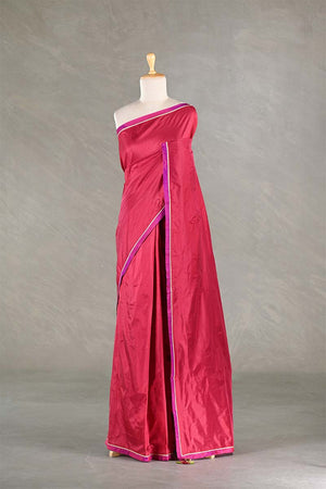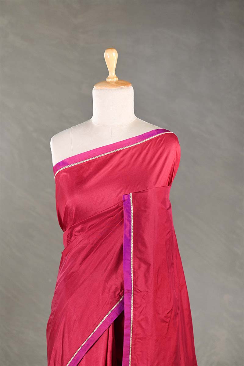 This maroon pure Banarasi silk saree features a plain dual-shaded woven body. The saree is finished with a narrow purple border enhanced with golden zari woven piping all over. The pallu corners are detailed with small potli tassels. It is paired with a chiniya silk blouse piece, designed with golden zari woven stripes and floral prints.