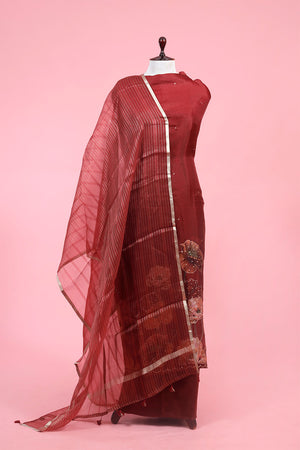 Pull off your inner diva with this amazing maroon silk suit piece by Chinaya Banaras. It has digital printed floral motifs along with sequence embellishments on the border along with organza silk striped woven dupatta with palin matching bottom. Made from a soft Organza silk that gives a soft texture to the skin. Ideal for any occasion, be it a birthday party, an office event, a festival, or any wedding. Pair this with a simple dupatta or stole, subtle gold jewellery, and bold makeup to balance the entire look.