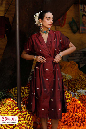 This rich maroon Banarasi Katan silk wrap dress is a stylish one-piece dress for women, featuring subtle gold and silver zari geometrical motifs all over. The notched collar, half sleeves, and knee-length silhouette give it a classy modern look, while the matching Banarasi silk fabric belt adds a defined shape to the waist.
