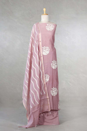 This mauve mulmul cotton suit set is ideal for casual wear and seasonal gatherings. The kurta features bird and floral appliqué buta spread across the fabric, adding soft surface detailing. It is paired with a cotton silk bottom pant and a matching mulmul cotton dupatta that is enhanced with appliqué leheriya work throughout. This comfortable dress material set offers a coordinated and easy-to-style outfit.