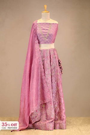 This Mauve organza silk stitched bridal lehenga for women is an eye-catching ensemble, highlighted with floral and pakshi motif applique work. The lehenga is adorned with aari, sequin, and bead embellishments, along with handmade tassel latkans for added charm. Paired with a designer blouse and an embellished dupatta, it makes a perfect bridal outfit.