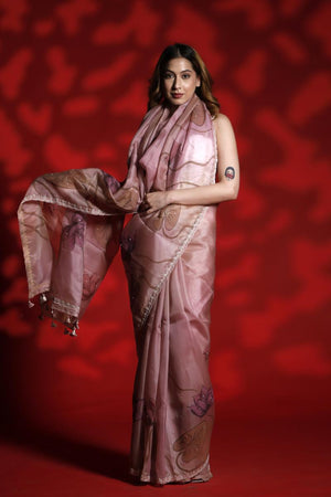 This mauve organza silk saree features a shaded base enhanced with hand-painted Pichwai and floral motifs on the pallu and pleats area. The motifs are accentuated with delicate beads embellishment for added detail. The saree is finished with an embellished scalloped border. It is paired with a shaded mauve Chiniya silk blouse piece, highlighted with sonarupa buti and hand-painted floral and Pichwai motifs.