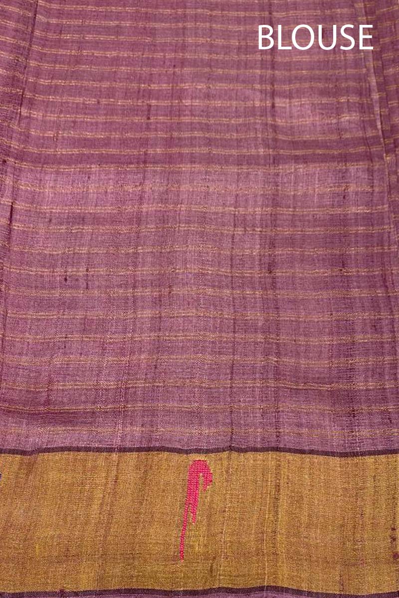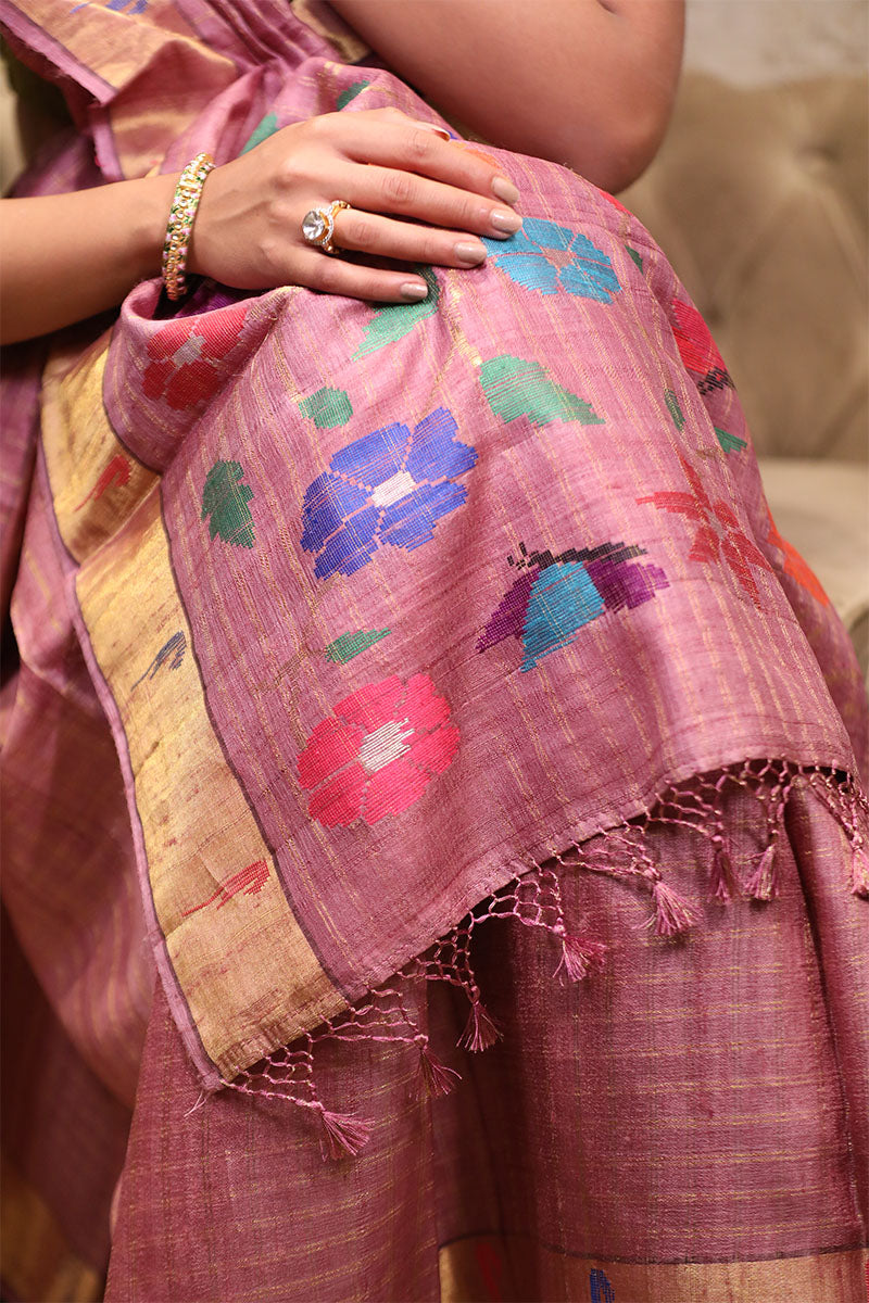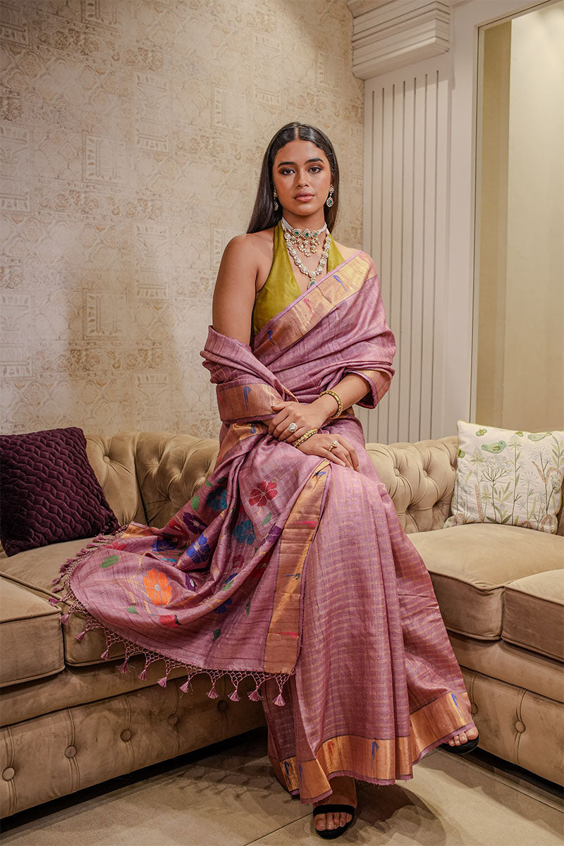 Dive into luxury with our exquisite Mauve Tussar Silk Saree, a celebration of elegance in every weave. Adorned with golden zari woven checks, this saree exudes regality. The paithani woven border and pallu add a touch of grandeur, making it a true masterpiece. Accompanied by a matching unstitched blouse piece, this ensemble pays homage to timeless craftsmanship, promising enduring charm. Elevate your ethnic wardrobe with the sumptuous texture and enchanting hues of this mauve saree, perfect for your special occasions.