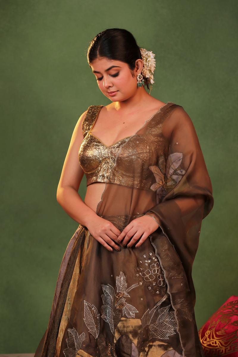 Styling Tips: Style this lehenga with statement gold jewelry, sleek hair, and minimal accessories to let the metallic tones stand out."