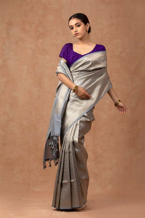 • The Saree is Crafted with watergold zari woven ethnic motifs all over saree border pallu.