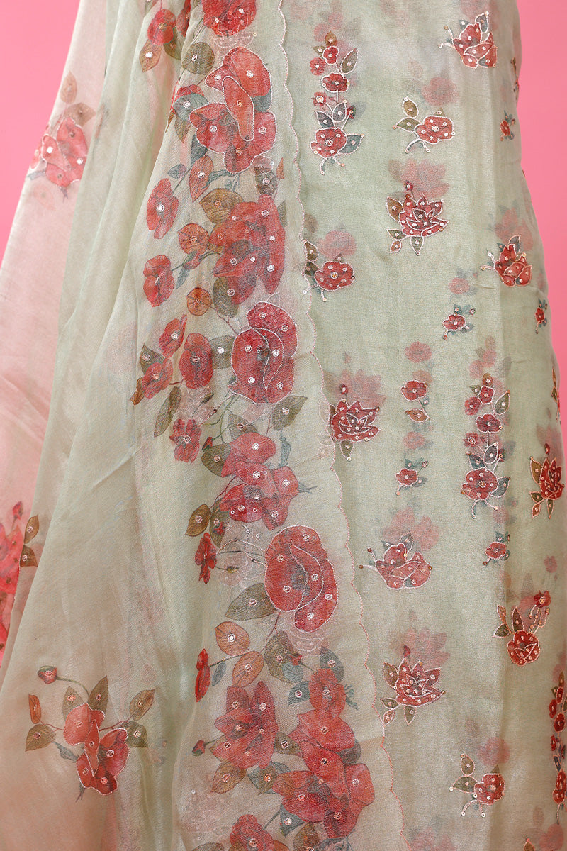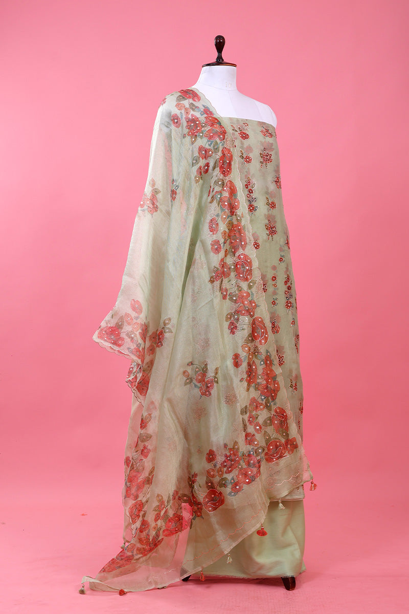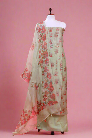 Showcasing a charming fusion of floral digital prints and intricate aari work buti adorning the top, this dress material is an epitome of grace. The ensemble exudes sophistication, complemented by a tissue silk floral digital printed scalloped dupatta, enriched with delicate aari work embellishments. Paired seamlessly with a plain matching bottom, this dress material promises a perfect balance of contemporary grace and traditional craftsmanship, making it an exquisite choice for any special occasion.
