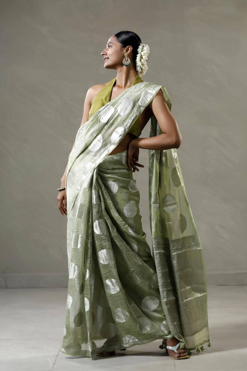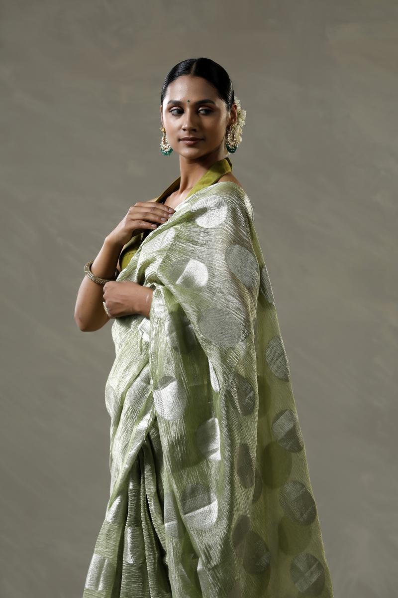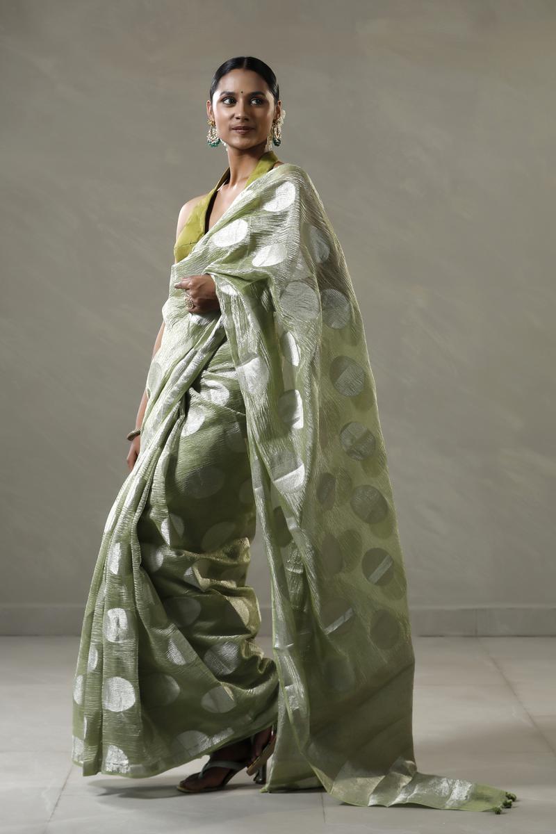 This mint green crushed tissue silk saree features silver zari woven circular buta spread gracefully across the body, lending a subtle sheen. The border and pallu are adorned with silver zari woven stripes, complementing the overall design. It comes with a matching unstitched blouse piece to complete the look.