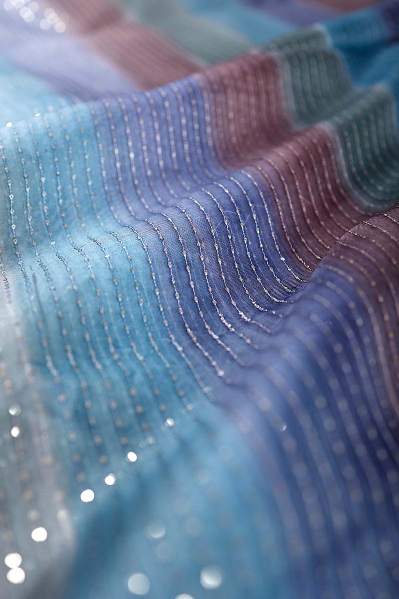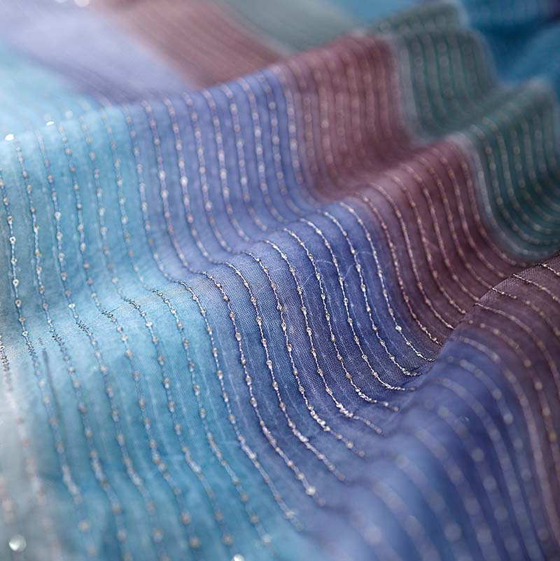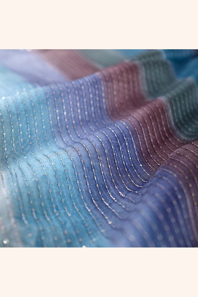 Experience elegance and sophistication with our organza silk fabric. Adorned with intricate sequin-embroidered stripes and exquisite rangkat dye, this fabric epitomizes sheer luxury. Its ethereal texture and delicate design make it perfect for creating stunning evening gowns, luxurious scarves, or elegant home decor. Elevate your style with this timeless and refined fabric.