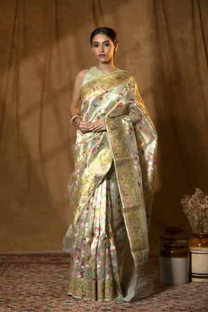 This cardamom-colored handloom Banarasi tissue silk saree is adorned with an exquisite meenakari resham woven floral and bird motif jaal across the fabric. The saree is further enhanced by a gold zari and resham woven border and pallu, adding depth and elegance. It comes with a matching running unstitched blouse piece, perfect for custom tailoring.