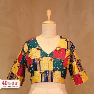 This multicolored Banarasi silk blouse is crafted from a beautiful blend of vibrant Banarasi threads, adorned with intricate sequin and Aari handwork. The V-shaped neckline and half sleeves add a modern touch to this traditional piece, making it a versatile option for any occasion. Its intense detailing and rich colors will instantly enhance any saree.